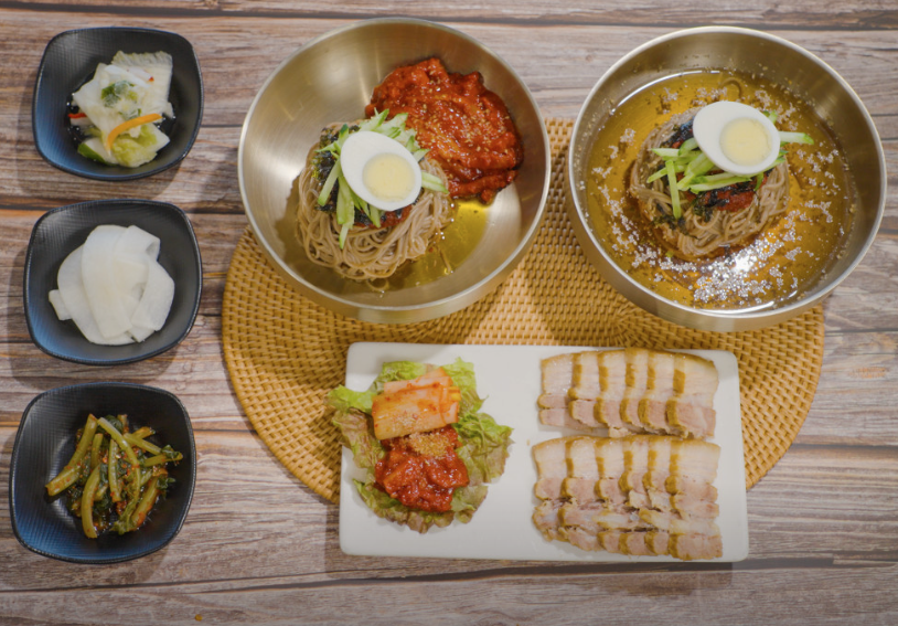 비빔막국수에 물막국수 국물을 조금씩 더해가며 먹는 독특한 방식이 특징입니다.