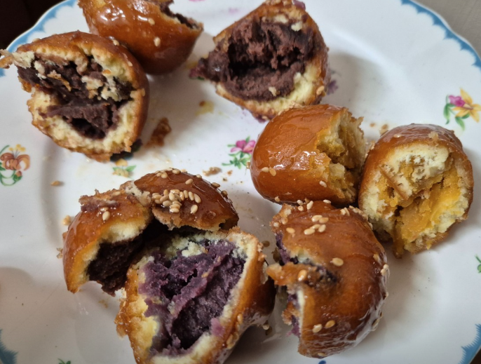 - 겉은 바삭하고 속은 촉촉한 찹쌀 도넛에 꿀과 팥앙금이 듬뿍