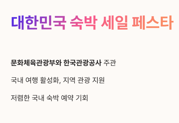 문화체육관광부와 한국관광공사가 주관하는 대한민국 숙박 세일 페스타는 국내 여행 활성화와 지역 관광 지원을 위해 마련된 행사입니다. 숙박 할인권을 통해 더 저렴하게 국내 숙박을 예약할 수 있어 국내 여행을 계획하는 분들에게는 절호의 찬스죠!